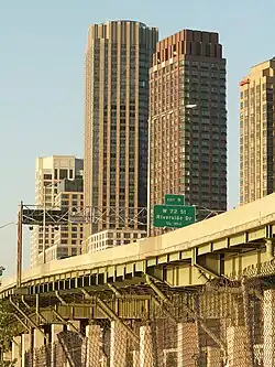 In the 1960s, Moses proposed straightening the West Side Highway, widening both the highway and the Henry Hudson Parkway, and constructing both the Lower Manhattan Expressway and the Mid-Manhattan Expressways, connecting routes that would have stretched across Manhattan. None of these projects were ever built. Later, in his 80s, he opposed the Westway project, but by that time his power was gone and his ideas generally weren't taken seriously. Rather than constructing a below-grade interstate highway, Moses proposed merely straightening and rebuilding the West Side Highway south of 59th Street.[27] Between 59th and 72nd Streets, the site of the former Penn Central 60th Street rail yard, he proposed bringing the highway to grade and moving it eastward to allow for a waterfront park and some housing at the southeast corner of the rail yard.[28] This was the nucleus of the idea that led to the plan for Riverside South.