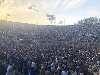 An October 2022 concert featuring Yeah Yeah Yeahs and Japanese Breakfast resulted in 62 noise complaints, the highest number recorded for the stadium.[21] In May 2023, the stadium was sued by the Forest Hills Gardens Corporation for violating the neighborhood's residential zoning regulations. In response, West Side Tennis Club and its booker countersued and a judge provided an injunction allowing for Burns Street to remain open for the over 30 concerts that were scheduled at the stadium that summer.[22] The stadium was sued three times in total for noise complaints in 2023.[23]