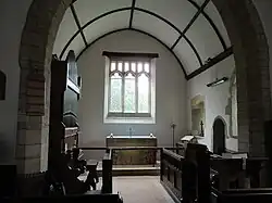 The chancel dates from the 13th century, with some alterations in the late 18th century. The nave and the tower (south of the nave) were rebuilt in 1840; the rebuilding used the original foundations, and so the chancel is not quite aligned with the nave, being slightly to the south. The stone font is of the 13th century. The tiled floor and seating were fitted in 1912.[3][5]