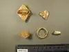 The hoard contains four gold finger-rings, a fragment of gold cloisonné jewellery, a piece of gold ingot, along with a lead spindle whorl.[4] The 2008 finds were found in three batches across two days and were a finger-ring set with a garnet, a finger-ring with an enlarged bezel, a finger-ring inlaid with niello, a partial gold ingot and a fragment of cloisonné.[5] The 2009 finds were a gold finger-ring with a round bezel, filigree and granulated decoration, as well as a lead disc, most likely a spindle whorl.[6]