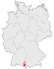 Westallgäu is the western part of the Allgäu in Germany. It contains large parts of the districts of Lindau in the southwest of the region, Swabia in Bavaria and the district of Ravensburg in the southeast of Baden-Württemberg. Westallgäu extends to the north to, amongst others, the towns of Leutkirch, Wangen and Isny. Westallgäu is bordered by Oberallgäu to the east and the Austrian state (Land) of Vorarlberg to the south. To the southwest, Westallgäu borders Lake Constance through the town of Lindau. The Adelegg mountains located in Westallgäu represent foothills of the Alps, reaching an altitude of 1,118 m at the Schwarzer Grat ("Black Ridge").