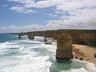 ![]() The Twelve Apostles, a collection of natural limestone stacks standing just off shore near Port Campbell. Their proximity to one another has made the site a popular tourist attraction. | |||||||||||||||