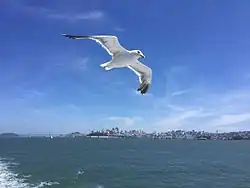 The western gull is a large gull that can measure 55 to 68 cm (22 to 27 in) in total length, spans 130 to 144 cm (51 to 57 in) across the wings, and weighs 800 to 1,400 g (1.8 to 3.1 lb).[3][4] The average mass among a survey of 48 gulls of the species was 1,011 g (2.229 lb).[5] Among standard measurements, the wing chord is 38 to 44.8 cm (15.0 to 17.6 in), the bill is 4.7 to 6.2 cm (1.9 to 2.4 in) and the tarsus is 5.8 to 7.5 cm (2.3 to 3.0 in).[3] The western gull has a white head and body, and upperparts or mantle is dark grey. The head generally remains white year-round, developing little to no streaking patterns in northern populations during the nonbreeding phase (basic plumage). It is debatable the extent of head markings can be found in pure Western Gulls as they form a hybrid zone with the glaucous-winged gull (Larus glaucescens) which has a more extensive hood. It has a large and bulbous-tipped yellow bill with a red subterminal spot (this is the small spot near the end of the bill that chicks peck in order to stimulate feeding). The eye colour varies, averaging pale yellow in southern populations and darker in northern populations. It closely resembles the slaty-backed gull (Larus schistisagus) of Asia, but the latter species has paler eyes, a straighter bill, deeper pink legs and eye orbitals, as well as conspicuous white spots ("string of pearls") on the inner primaries when seen in flight not seen in Western Gulls. Western gulls take approximately four years to reach their full plumage,[6] their layer of feathers and the patterns and colors on the feathers. In adult plumage, The largest western gull colony is on the Farallon Islands, located about 26 mi (40 km) west of San Francisco, California;[7] an estimated 30,000 gulls live in the San Francisco Bay area. Western gulls also live in the Oregon Coast.[8]