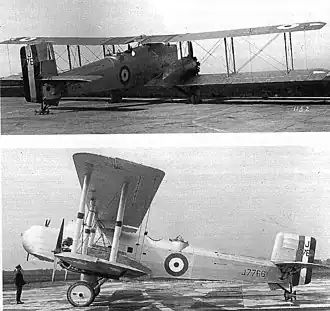 The first aircraft J7765 was delivered to the A&AEE at RAF Martlesham Heath in 1926 and 1927. J7766, delivered the following year, was distinguished by having engine nacelles that extended aft of the trailing edge of the wing, the wing with duralumin spars and a metal-covered wing centre section, and a more rounded nose shape.[2] The modified nose and nacelle shapes were also introduced on the first prototype.[3]