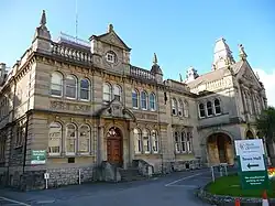Weston's Local Board became the Urban District Council in 1894. In 1897 The town hall was extended southwards and eastwards, to a design by Hans Price, creating a new frontage along Walliscote Grove Road.[7] In the centre, projecting forward from the rest, was an arcaded porte-cochère with four round headed windows on the first floor, flanked by Corinthian order columns, and a pediment above.[1] A new wing to the south had an arched doorway with an elaborate carved pediment, twin round headed windows on the first floor and an oculus above.[1] To the north Price provided a new tower,[1] which was equipped with a chiming clock (by W. J. Perret of Weston) and four bells, cast by Llewellins & James of Bristol.[8] Internally, the principal room (above the porte-cochère) was the new council chamber.[2] The total cost of the new extension was around £5,000.[5] A new committee room was added to the complex in 1909;[5] and in 1927 a north wing was added, built in a sympathetic style, which extended along Oxford Street (leaving Wilson's earlier town hall almost entirely enclosed).[1]