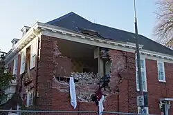 The last owners, Stephanie and Len May, purchased the building in 1997 when it was in need of significant renovation.[13] The first earthquake in September 2010 felled a chimney, damaged the roof and internal plaster. Repairs saw the house reopen as a bed and breakfast by November 2010. The 2010 Boxing Day earthquake further damaged the building and the bed and breakfast had to close again. Damage was substantial after the February 2011 earthquake and the house was red-stickered by the authorities, meaning that access was prohibited. Despite that, the owners continued to retrieve their possessions but stopped entering the building after the June 2011 earthquake, when further damage was sustained. Weston House was demolished in July 2011.[18] The Christchurch newspaper The Press featured significant buildings damaged by the earthquake, with Weston House part of the page.[19]