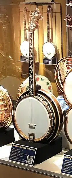 This Weymann Orchestra Style 4 banjo (1926), is displayed at the American Banjo Museum as an example of highly decorated Jazz Age banjos.