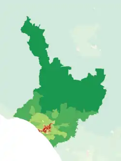 Whanganui District covers 2,373.27 km2 (916.32 sq mi)[1] and had an estimated population of 48,900 as of June 2024,[2] with a population density of 21 people per km2. All but some 6,300 people in the Whanganui District live in the city itself, meaning there are few prominent outlying settlements. A small but notable village is Jerusalem.