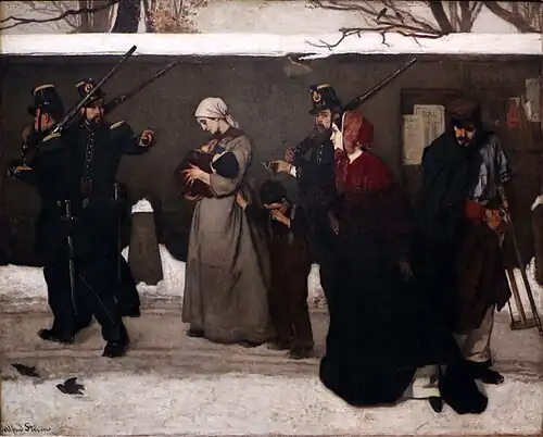 The choice of the wintry season, the gloomy light, the dark shades of the clothes and uniforms, the absence of a horizon (blocked by the dark grey wall in the background which fills the entire width of the painting), the simplicity of the characters (the cold and unwavering soldiers, the mother resigned, the lame worker with his crutch, the tearful child, and the wealthy woman attempting an act of generosity) all contribute to making this scene spontaneously moving.[2]