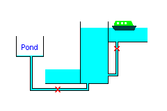 The locks at Buckby were all built with side ponds, to conserve water. These are maintained at an intermediate level between the upper and lower pound. When a lock is emptying, water from the top of the lock fills the side pond, and the rest is then discharged to the lower pound. When a lock is filling, the bottom of the lock is filled from the pond, and the rest is drawn from the upper pound. Typically, this system uses 40 per cent less water, but the ponds have been disused for a long time, and an electric pump is now used to pump water from the bottom of the flight to the top.[4] The Grand Junction Canal experimented with side ponds from the early 1800s. The locks at Bourne End had several radial ponds, but use of the ponds was abandoned because it took too long to use the lock. Those at Buckby had two rectangular side ponds per lock, at different levels, and this design was eventually installed at most locks between Buckby and lock 45 at Bulbourne, the junction with the Wendover Arm.[5]