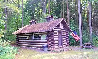 The New Deal enacted during the Great Depression led to a boom in construction of state park facilities in Pennsylvania and Whipple Dam was no exception. Unemployed young men were hired by the Civilian Conservation Corps to clear streams of brush, plant many acres of trees in a reforestation effort, build bridges on state roads, and clear roads through the forests for fire prevention. The CCC built many facilities that are still in use today including pavilions, restrooms, roads and the beach. They also dismantled the 1928 dam and constructed a new dam and bridge in 1935. Their work was placed on the National Register of Historic Places in 1987.[1][5][6]