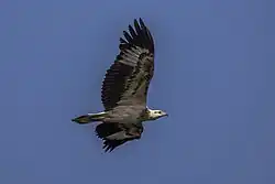 Adult white-bellied sea eagles are unmistakable and unlikely to be confused with any other bird. Immature birds can be confused with wedge-tailed eagles. However, the plumage of the latter is darker, the tail longer, and the legs feathered. They might also be confused with the black-breasted buzzard (Hamirostra melanosternon), but this species is much smaller, has white patches on the wings, and has a more undulating flight.[26] In India, the Egyptian vulture has white plumage, but is smaller and has a whiter back and wings. The white tail of the white-bellied sea eagle in flight distinguishes it from other species of large eagles.[27] In the Philippines, it can be confused with the Philippine eagle, which can be distinguished by its crest; immature white-bellied sea eagles resemble immature grey-headed fish eagles, but can be identified by their more wholly dark brown underparts and flight feathers, and wedge-shaped tail.[28]