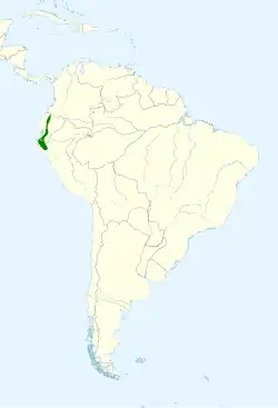 It is found in Ecuador and Peru. Its natural habitats are subtropical or tropical dry forest, subtropical or tropical moist lowland forest, subtropical or tropical moist montane forest, and heavily degraded former forest.