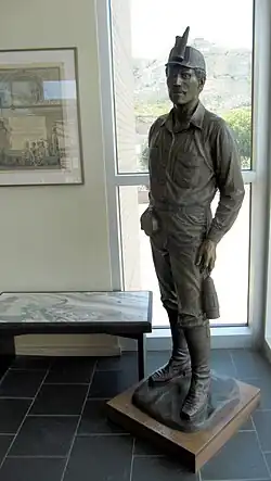 The White Ash Mine was abandoned after the flood and the bodies of the ten miners were never recovered.[3] They are commemorated by a bronze statue in the Mines Museum of Earth Science, shown at right above, and by an information plaque placed near the site of the shaft at the west end of 12th Street in Golden by the Colorado School of Mines. An older bronze plaque at the site, shown at left, reads as follows: