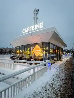 On the western side, the bridge hosts Baltas Tiltas Food Hall which offers drinks, snacks and small restaurants with different cuisines as well as outdoor seating.[2] Caffeine coffee shop and Iki Express convenience store are on the eastern side.[3]