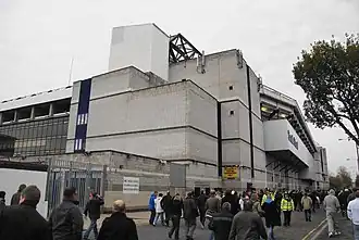 Also as a response to the Hillsborough disaster, and the subsequent Taylor Report of 1990 that called for all-seater stadiums, standing areas were removed over the next few years, further reducing the capacity of the ground. Standing areas on the lower terraces of the East and South stands were replaced with seating in 1992, followed by the North Stand the next year. The South Stand was demolished in 1994, and its redevelopment completed in March 1995. The work was partly funded by the Football Trust. The first Jumbotron video screen for live coverage and screening of away matches was also installed above the South Stand,[22] and there would eventually be two screens, one above each penalty area. The renovation, and the addition of a second tier to the Members' (North) Stand on Paxton Road, was completed in 1998, leaving the stadium with a capacity of 36,240.[49] The stadium would stay in this form, bar some minor adjustments, until 2016, when the north-east corner of the stadium was demolished to allow for the construction of a new stadium, while the final 2016–17 season was being played at White Hart Lane.[50]