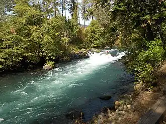 The White Salmon River is a 44-mile (71 km) tributary of the Columbia River in the U.S. state of Washington.[3] Originating on the slopes of Mount Adams, it flows into the Columbia Gorge near the community of Underwood. Parts of the river have been designated Wild and Scenic. The principal tributaries of the White Salmon River include Trout Lake and Buck, Mill, Dry, Gilmer, and Rattlesnake Creeks.[6]