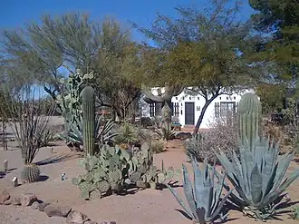 It was founded in 1900 as squatter's cattle ranch. Legal ownership was established via homesteading in 1936, and it was opened as a guest ranch, also known as a dude ranch, in the early 1940s, when it was known as the CB Bar Ranch.[3] Six buildings where guests could stay were built after the property was acquired by Max Zimmerman in 1945, and it became the MZ Bar Ranch.[4] Or it was bought in 1940 by "Chicago liquor store owner Max Zimmerman", who had moved to the area "to become part of the once vibrant guest ranching industry in Tucson."[5]