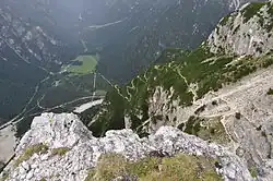 In the summer of 1916 the Italians mounted fresh attacks on the Austro-Hungarian positions on the Forame heights to the west of Rauhkofel. The plan was for a group of volunteers to work their way behind Austro-Hungarian lines at night and attack at dawn, when the main Italian forces would advance out of their trenches. Early in the morning of 29 August this plan was executed. Surprised, the Austro-Hungarians retreated leaving the Italians in control on the first ridge of the Forame, before progress halted.[15] Between 4 and 6 September the Italians tried to push their way down the valley between Forame and Costa Bella, but constant Austrian fire stopped them advancing. Then, in a surprise counterattack in 13 September, the Austro-Hungarians retook the peak of Forame, and quickly hoisted up artillery and mortars to ensure they could not be removed again.[14]