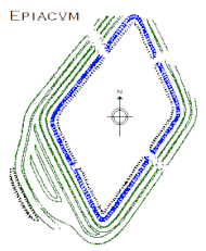 Epiacum, however, has two unique features.[5] First, the fort's military engineers modified the usual rectangular plan to suit the available site: it is distorted into a lozenge or parallelogram; the internal features of the fort are similarly distorted.[5] Six barracks were however fitted in behind the headquarters building (principia), and four in front of it, in a limited area of 1.25 hectares (3.1 acres).[5] Second, the wall is surrounded by four steep defensive ditches and banks around the hill spur, and seven such ramparts across the uphill side of the spur.[4][8] These constitute the most complex defensive earthworks of any known Roman fort, with multiple banks and ditches outside the usual stone ramparts.[8]