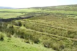 Whitley Castle is one of the most isolated Roman sites in Britain, which may help to explain both why it remains largely unexcavated as of 2018 and why so much of it has survived.[5] The site is a lozenge-shaped spur of high ground on Castle Nook hill farm,[6] under permanent pasture for sheep. The fort remains lie under the grass, and are most clearly seen in aerial photographs.[7] The Roman fort itself covers about 4 acres (1.6 ha); outside it is a system of concentric defensive ditches.[8]
