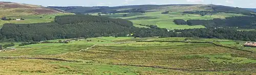 Whitley Castle is about 1,000 ft (300 m) above sea level in the Pennine hills on the southern edge of Northumberland near its border with Cumbria. It lies to the west of the modern A689 road beside the Pennine Way long-distance footpath.[3] During the Roman era, Epiacum was situated about 15 miles (24 km) south of Hadrian's Wall and 20 miles (32 km) north of the main road which ran between Luguvalium (Carlisle) in the northwest and Eboracum (York) in the southeast.[4] The Maiden Way road connected Whitley Castle to the fort of Magnae (Carvoran) on Hadrian's Wall to the north, and the fort of Bravoniacum (Kirkby Thore) on the Carlisle-York road to the south.