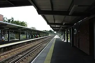 Whitton railway station is in the London Borough of Richmond upon Thames in southwest London, within Travelcard Zone 5. It is 12 miles 43 chains (20.2 km) down the line from London Waterloo. The station and all trains serving it are operated by South Western Railway. The station was extensively refurbished and its main buildings replaced 2015–2016. The footbridge was replaced so as to incorporate optional lifts to the platforms. Whitton station has a ticket office above the up (London-bound) platform containing a coffee shop, a taxi office, ticket machines and a disabled toilet. The station, to allow periods of no staff, lacks ticket barriers. The operator has had call at the station on most weekdays since 2014 air-conditioned, ten-coach trains.[2] The platforms were extended away from the building and footbridge in February 2012.