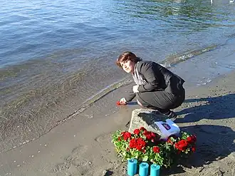 On 4 September 2015, Akreyi organized moments of silence or prayer to honor the victims of the global refugee crisis unfolding on the shores of Europe and elsewhere. People worldwide paid tribute in memory of Alan Kurdi, his brother, his mother, their loved-ones, thousands of children who had lost their lives fleeing armed conflicts and over 2,500 refugees who had died in summer 2015 attempting to cross the Mediterranean to Europe.[39] During a beach memorial, Akreyi expressed condolences to the families and friends of victims and called on the international community to share equitably the responsibility for protecting, assisting and hosting refugees in accordance with principles of international solidarity and human rights.[40][41] She thanked volunteers and humanitarian workers for their efforts in aiding refugees.[39]