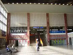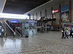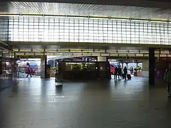 The interior of the Südbahnhof comprised a large hall with small shops and ticket counters around the edges. Platforms 11–18 (equivalent to the old Ostbahn) were one level higher, and platforms 1–9 (equivalent to the old Südbahn) were two levels above the main hall.
