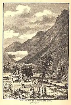 illustration from The Heart of the Alleghanies depicting "Campbell's lowly cabin in the center of the narrow corn-fields" beside the "limpid" Nantahala River