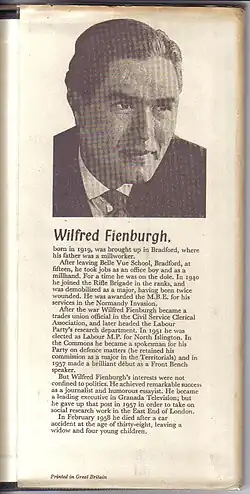 Wilfred Fienburgh represented Islington North until his death in a car crash in 1958, aged 38. At the resulting by-election the seat was retained for Labour by Gerry Reynolds with an increased majority.