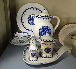 The focus of Kåge's early ceramic designs, as of much of Swedish design of this period was on practical solutions to social issues, an example of which was his Praktika (1933), a simply designed and stackable set of tableware aimed at working-class families.[5] Praktika was a commercial failure, as the intended buyers preferred more traditional and ornate products.[6]