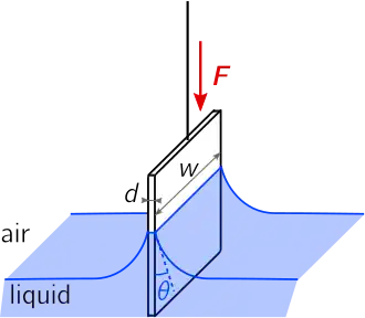 In general, surface tension may be measured with high sensitivity using very thin plates ranging in thickness from 0.1 to 0.002 mm. The device is calibrated with pure liquids like water and ethanol. The buoyancy adjustment is minimized by utilizing a thin plate and dipping it as little as feasible. Wetting water on a platinum plate is accomplished by using commercially available platinum plates that have been roughened to improve wettability.[3]