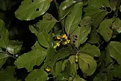 Wilkiea longipes is a shrub or small tree that typically grows to a height of 0.75–15 m (2 ft 6 in – 49 ft 3 in). Its leaves are elliptic to egg-shaped with the narrower end towards the base, 85–260 mm (3.3–10.2 in) long and 40–120 mm (1.6–4.7 in) wide on a petiole 8–20 mm (0.31–0.79 in) long. The leaves have scalloped edges and the midvein is prominent on the lower surface. Male and female flowers are borne on separate plants. Male flowers are borne in leaf axils, sometimes on woody branches, in clusters of 5 to 11, up to 8.5 mm (0.33 in) long, each flower club-shaped to spherical 2–3 mm (0.079–0.118 in) long with 4 pairs of tepals, on a pedicel 15–20 mm (0.59–0.79 in) long with 3 or 4 pairs of stamens. Female flowers are borne in leaf axils in groups of 3, mostly 3.0–4.5 mm (0.12–0.18 in) long, each flower more or less spherical, about 4 mm (0.16 in) in diameter on a pedicel 15–18 mm (0.59–0.71 in) long, with 9 to 13 carpels. Flowering occurs from November to May, and the fruit is a spherical to oval, black or dark blue drupe 12–16 mm (0.47–0.63 in) long and 10–13 mm (0.39–0.51 in) wide.[2]