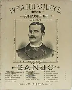 William A. Penno (1843–1929), known by his stage name William A. Huntley, was a composer, music teacher, and vocal and instrumental performer in minstrel and vaudeville traditions. Playing his 5-string banjo before crowds that came to number in the low thousands, he sang in a high tenor and played his banjo bare fingered, picking the strings in a style today named "classic banjo." His published compositions include banjo instrumentals and parlor music. Huntley spent his working life performing and teaching in the off season. He performed throughout the United States and toured Europe as a part of several different minstrel groups.[3] A highlight of his performing career was to play before the Prince and Princess of Wales, about 1880 at Her Majesty's Theatre in London.[3] He moved away from minstrel shows by the 1880s, and "took pride" that he could perform without blackface stage makeup.[3] He focused on building respectability for the banjo, through teaching, composition, and performance recitals.[3] He was featured in the S. S. Stewart Company's catalog (showing that art-banjo promoter Stewart recognized his talent) and began to play the company's banjeaurine.[3] In 1888 he performed before a crowd of 2,000 people in his hometown, Providence, Rhode Island.[3]