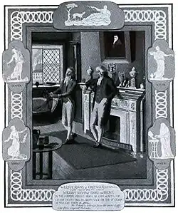 Depiction of William Adams (leaning against fireplace) with a cousin of the same name, at the former's house in Greengates