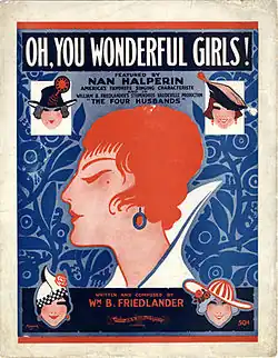 Friedlander married the Russian-born Nan Halperin, a vaudeville performer, and composed all the songs she used in her act.[4] During the 1910s and 1920s he produced a number of tabloid shows for vaudeville. The Suffragettes was a very successful tab show featuring Nan Halperin.[5] In 1916 W.B. Friedlander Inc. produced Salamander Sallies by Will M. Hough (1882–1962) and Friedlander, The Night Clerk headed by Frank Ellis, The Four Husbands with Howard Burkholder and George W. Jenks, among others. The shows were booked through vaudeville houses. The company said it planned to produce a new revue called the Friedlander Show with seven complete stage settings and 34 people.[6]