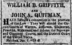 He was a native of New Jersey and graduated from the College of New Jersey.[1] He may have been resident in Natchez by 1818.[2] In the 1820s, Griffith had a law partnership with a young John A. Quitman.[3] Griffith was resident in Natchez first, and Quitman arrived in 1822 with a letter of introduction.[4] Griffith was "said to have been the most polished orator that had yet appeared in Mississippi."[5] He was appointed by President James Monroe to serve as United States Attorney for the District of Mississippi, holding this office from 1822 to 1828, when he was succeeded by Felix Huston.[6] In February 1827, he was elected by the Mississippi state legislature as a justice of the Supreme Court of Mississippi, but Griffith declined the office. According to Dunbar Rowland, "[George Winchester] was a candidate for judge of the supreme court in February, 1827, to succeed Hampton, but the vote was 19 to 16, for William B. Griffith. When the latter declined, the governor appointed Judge Winchester."[7]