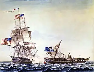 On 15 September, shortly after the War of 1812 broke out between the United Kingdom and the United States, Bainbridge was appointed to command the 44-gun frigate USS Constitution, succeeding Captain Isaac Hull.[26] Constitution was an enormous frigate of 1,533 tons, armed with 24-pounders, which had already captured the 38-gun frigate HMS Guerriere of 1,072 tons. Under Bainbridge, she was sent to cruise in the South Atlantic.[14][27]