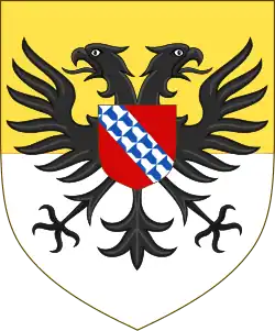 Per fesse or and argent an eagle displayed with two heads sable, on the breast an escutcheon gules charged with a bend vair.