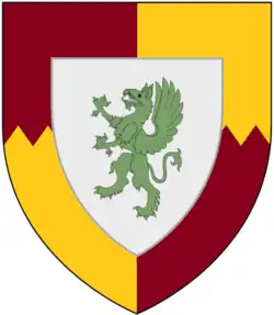 Quarterly per fess indented Gules and Or an escutcheon Argent charged with a griffin segreant Vert