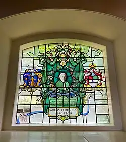 The epitaph, although lost from the grave is included in the stained glass window by John Hayward. The window design includes a chaplet of flowers from Curtis's Flora Londinensis.