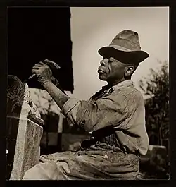 Edmondson had a large audience in Edgehill as many of his figures were on display not only in his yard, but in that of neighbors' homes and gardens. A few years into Edmondson's sculpting career, Peabody College art enthusiast Sidney Hirsch wandered through Edgehill and came upon Edmondson's vast sculpture collection.[16] This is widely documented as Edmondson's "discovery" by Sidney Mttron Hirsch. Hirsch himself was a collector of African, Middle Eastern, and East Asian art and became one of Edmondson's greatest supporters.[16] With this exposure, friends of Hirsch's and other fellow members of Nashville's elite bought Edmondson's sculptures for their homes, gardens, and offices, many of which were later displayed in exhibits at the Smithsonian American Art Museum and the Cheekwood Botanical Garden and Museum of Art.[17] Of Hirsch's friends, Alfred and Elizabeth Starr, Alfred, a managing partner of a chain of movie theaters catering to the black community, and his wife Elizabeth, a painter, also became enthusiastic patrons and supporters of Edmondson's work. They introduced Edmondson to several artist friends, including Starr's boyhood friend Meyer (Mike) Wolfe and his wife Louise Dahl-Wolfe. Dahl-Wolfe was a photographer who had recently begun work for Harper's Bazaar fashion magazine in New York. She made over a hundred photographs of Edmondson's at work in his backyard shop, which she presented to the editor of Harper's Bazaar. She attempted to publish his work but newspaper chain mogul William Randolph Hearst had a prejudice against showing Negro art as he saw them as nothing other than servants.[18][10] She then brought Edmondson's work to the attention of fellow Tennessean Thomas Mabry and his boss Alfred Barr, the director of the Museum of Modern Art (MoMA).[19]