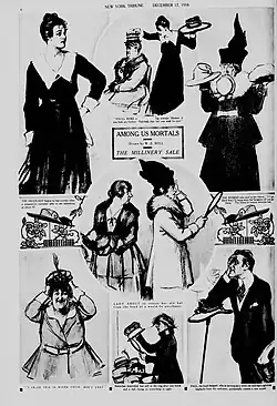 Every Sunday, a full-page of Hill's themed illustrations was published in the New York Tribune and, after 1917, The Washington Times. Everyday themes of the week included The Medical Profession,[19] Men's Business Lunch,[20] The Intellectuals,[21] The Soda Fountain,[22] The Millinery Sale,[23] The Suburban Station,[24] and dozens more. Occasionally Hill published "Among Us Mortals" pages with more specific or entertainment-based themes, like The War Play,[25] The Sudden Shower,[26] The Poetry of Motion,[27] By The Sad Sea Waves,[28] The Amateur Vaudeville,[29] The Ladies' Choral Club,[30] and Between The Acts.[31]