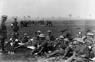 Braithwaite returned to the front in February 1918 as a brigadier general, general staff (BGGS) in a British corps[19] and was made a Companion of the Order of the Bath in June.[1] In October, he was placed in command of the 16th Infantry Brigade when its previous commander, Brigadier General Henry Walker, was wounded in an artillery barrage,[20] and led it through to the armistice of 11 November 1918.[21] During the course of the First World War he had been mentioned in despatches six times.[2]