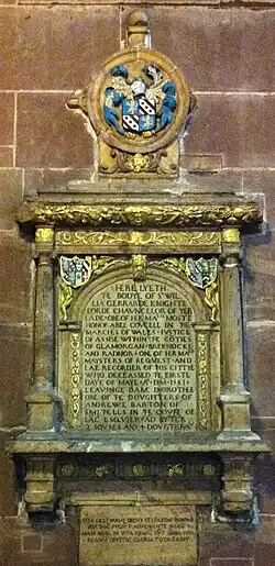 By 1580 it was clear that he could not live long, and the Queen gave him permission to retire to Chester. He had planned to visit London in March of that year, but found himself "lame beyond hope of recovery". He wrote a loyal letter to Elizabeth I, saying that he hoped to see her one more time even if he had to crawl all the way to London, but by then he was too ill to leave Chester, where he died in early May 1581.[14] He was buried in St. Oswald's Church, Chester, then situated within Chester Cathedral,[15][16] where survives his mural monument. Much of his will is devoted to a description of his financial troubles and the difficulties he experienced in providing for his family.[5]