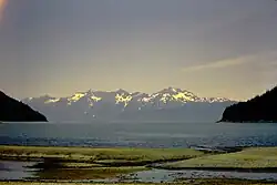 The bay is situated 45 miles (72 km) northwest of Juneau on the western portion of the Lynn Canal.[5] It is about 0.75 miles (0.65 nmi; 1.21 km) long and about 4 cables — i.e., about 960 yards (880 m) — in width. The Beardslee River flows down a few cascades into its head.[6] About 4 miles (6.4 km) northwest of the bay is the Endicott River, coming in from the west through a narrow, deep gorge in the mountains.[7]