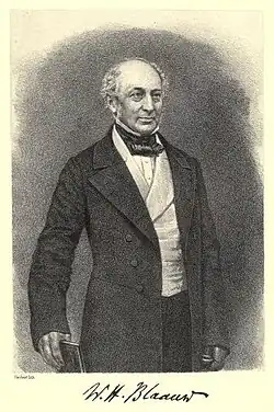 Blaauw was born in London on 25 May 1793. His father William Blaauw, of Queen Anne's Street,[1] was a Dutch immigrant, from a line of burgomasters of Amsterdam; William's second wife, Louisa Puller was daughter of Christopher Puller of Woodford, Essex. William's elder daughter from his first marriage (to Anne Charlotte, daughter of Charles Le Maitre), Maria Anne, was the first wife of the politician Thomas Gardiner Bramston.[2][3] He was educated at Eton College and Christ Church, Oxford, where, taking a first class in classics, he graduated B.A. in 1813, and M.A. in 1815. He was elected a fellow of the Society of Antiquaries of London in 1850, was treasurer of the Camden Society for many years, and was a member of other learned societies.[4]