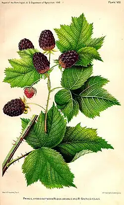 Lithograph created by Prestele of Rubus crataegifolius (Korean Raspberry) and Rubus ursinus (California Blackberry)