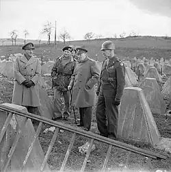 Operation Grenade was finally launched on 23 February, even though the water level had not yet completely returned to normal.[49] The attack was successfully concluded on 5 March, with the Rhine reached.[50] Next came Operation Plunder, the 21st Army Group's crossing of the Rhine; the Ninth Army's part was called Operation Flashpoint.[51] The Rhine was crossed on 24 March 1945.[52] On 1 April, the Ninth Army made contact with First Army, making a complete encirclement of the Ruhr.[53] Three days later, the Ninth Army reverted to the control of Bradley's 12th Army Group.[54] On 11 April, the Ninth Army reached the Elbe.[55]